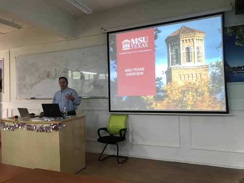 广东工业大学华立学院国际交流中心于2018年11月8日,如期开展国际交流活动,来自MSU国际部战略发展顾问Jason刘晓健,还有MSU 国际教育中心主任Michael Thomas Mills,为有意向出国深造的同学介绍中西州立大学的学校概况,并进行授课。