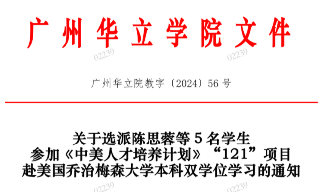 据悉,在2024年的“121”项目中,乔治梅森大学今年从中国的133所“121”成员大学中共录取50名学生,其中广州华立学院5名,占比高达10%。充分展示了广州华立学院学生的专业素养、英语交流能力和综合素质,同时也凸显了国际学院独特的全英语授课平台在国际化人才培养方面所发挥的作用与成效。