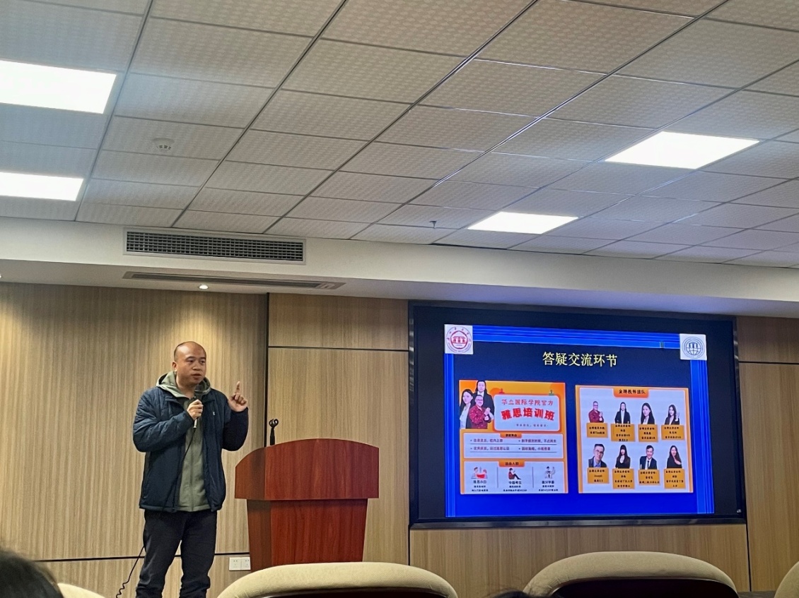 活动伊始,国际学院院长唐书泽教授应邀致词。他简要介绍了国际学院为何要为同学们开办雅思提升班,为何是在这个时候开班,而不是2022年或2023年。唐院长指出,在董事会和学校的鼓励与支持下,国际学院自2023级开始实施全英语教学,创建全国民办高校中独一无二的“华立全英教学平台,培养合格世界公民”应用型国际化人才培养环境氛围,独特平台成功吸引了《中美人才培养计划》“121”项目,美国、英国、韩国、意大利、澳大利亚、新西兰、泰国、俄罗斯等国世界名校合作项目,为华立学子提供本科、硕士、博士多层次留学深造途径,但几乎所有世界名校合作项目都需过雅思关,雅思刚性需求成为我们服务同学的神圣职责。第二,我们学校地处增城郊区,远离广州市闹市,周围没有合格求学场所。第三最为重要,国际学院一年来已引进一大批留学回国雅思“高手”和专业“大咖”,他(她)们不仅持有7.5、8.0、8.5、甚至9.0的高分记录,更有个人出国求学的励志故事。唐院长相信同学们会慢慢体会到国际学院全心服务同学们的良苦用心。他期望同学们抓住基于,克服困难,定能圆梦。