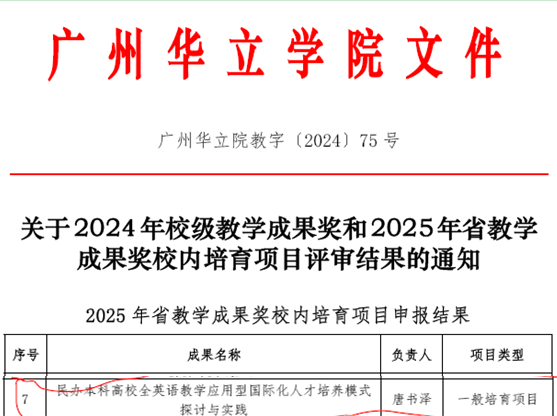 2024年10月9日,学校下文(院教字【2024】75号),公布2025年省教学成果奖校内培育项目评审结果,唐书泽教授领衔的“民办本科全英语教学应用型国际化人才培养模式探讨与实践”获批。根据要求,教务处组织项目中期检查。