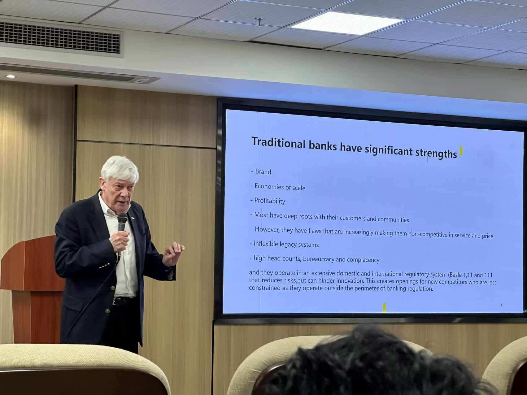 2025年4月3日下午,加拿大圣玛丽大学前校长、金融学国际名师、加拿大中央银行理事会前理事、中国教育部“985”和“双一流”大学本科教学审核评估特邀外籍专家科林・多兹(Colin Dodds)应邀到访广州华立学院国际学院,在4-205学术报告厅作了《在全球变革与不断变化的竞争中,银行业的前景是进化还是革命》的主题讲座。国际学院全体教师、2022级和2023级学生百余人到场听讲。讲座由金融学教授陈浩钧博士主持,院长唐书泽教授致欢迎词。全程使用英语。