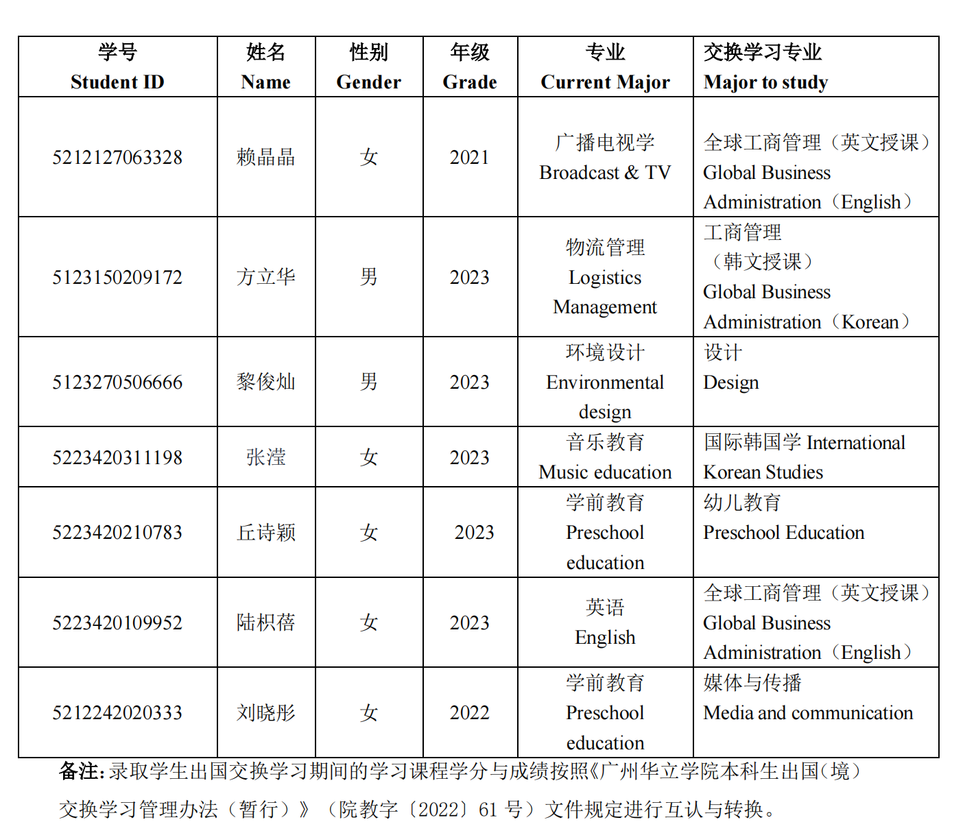 广州华立学院本科学生2024年赴韩国庆星大学免学费交换生拟录取名单公示