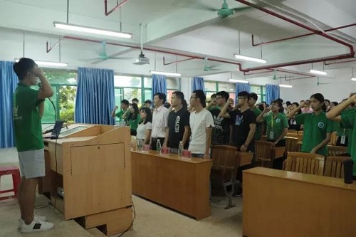 纪检部干事刘家良上台带领大家宣誓,不扰乱考场秩序,诚信考试,不违纪不作弊,做文明守纪管理人。