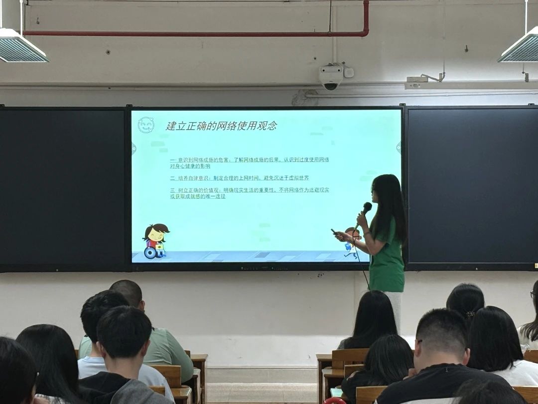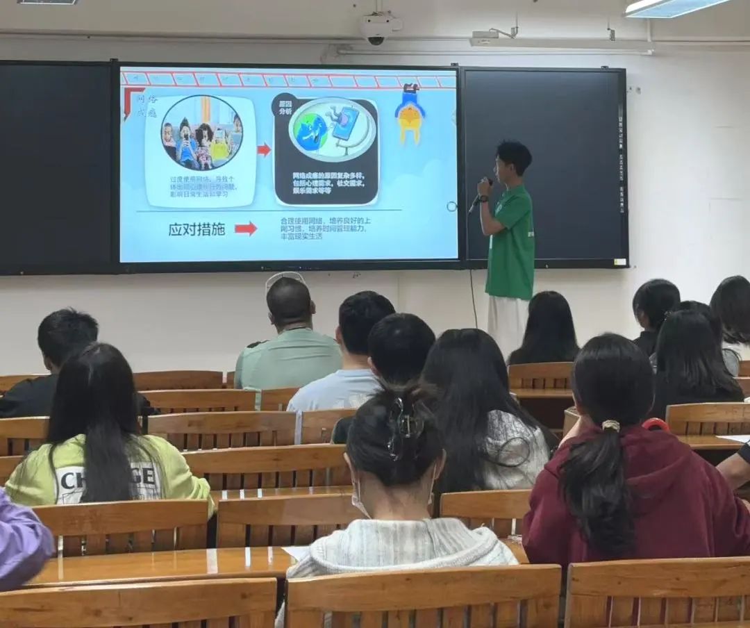 在会议的过程中,主持人向大家分析了产生网络心理健康问题的因素,随后给大家播放了一段关于网络心理健康的视频,带大家深入了解了网络环境对个体心理健康的影响。接着,我们共同讨论了,在网络时代下,心理委员应当如何更好地发挥作用。