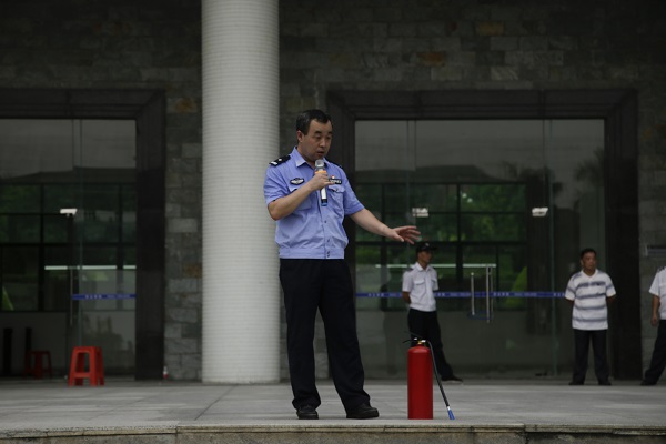 杨亚州警官首先为大家做消防知识教育培训,强调了消防安全培训的重要意义和必要性,消防器材使用方法、火灾逃生注意事项等进行了详细讲解,并通过现场示范消防水枪连接和使用,消毒面具和湿水毛巾的正确用法,灭火器的分类及操作方法。