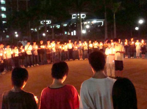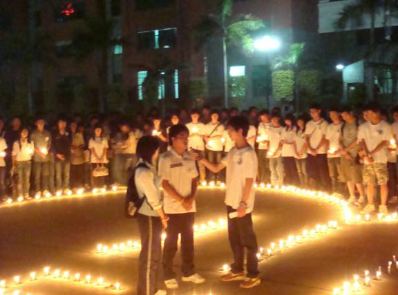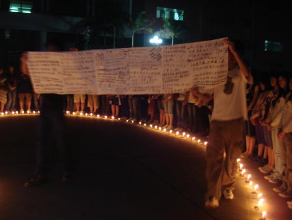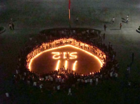 2008年5月21日21时整,在华立综合楼前,管理学部团总支学生会举行了追悼会,为在这次地震中失去生命的人们志哀。800支蜡烛围成的心形图案,以及显眼的“5.12”、“川”字,被大家的爱包围,默默传递着我们对灾区人民的爱和支持。希望遇难者可以安息,也愿幸存者变得坚强。