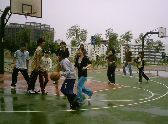 团结的力量是可以战胜一切困难的,一点点小小的障碍可以拦得住我们吗?这不就是团日活动需要的凝聚力吗?在接下来得比赛中,不时还会下起零丁小雨,但是都没人要离场,反而却越玩越激烈。男生们在雨中飞窜流转,在三分线外表演精彩的运球、妙传和抢断,优美的动作和激情的吼叫调动起同学们打球的热情。很多在平时不运动的女生都跑上场去玩,略显羞怯和笨拙的动作让人看的又爱怜又好笑。有些运动细胞比较强的女生们则在三分线内大秀特秀投篮,即使这弧线并不太完美,但也变得跳跃起来,形成了篮球场上一道亮丽的风景线!场外观看的同学们虽然要撑着伞,但激情却有增无减,尽情呐喊助威,他响亮的欢呼声和热烈的掌声把整个场地都沸腾起来了,那点点小雨算啥?