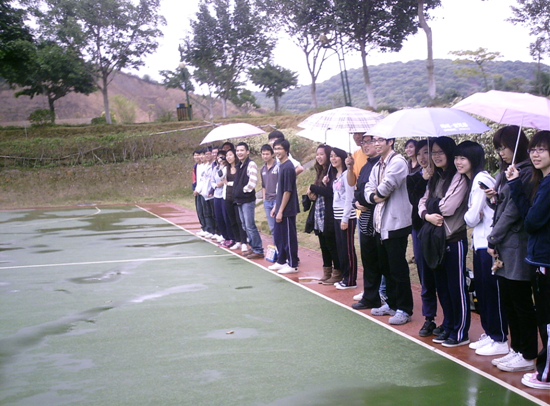 25日却下起了磅礴大雨。“不能随便放弃,决定了的事就要坚持下去”,这也是当代青年必须坚守的准则,所以我们决定不管风雨,活动都要继续进行。为了让活动正常开展,班干部们纷纷自发地到场地去扫水。雨后的气温分明地下降了不少,但是班干部们没有一人抱怨,也没有一人说要放弃,个个拿着扫帚扫得不亦乐乎。