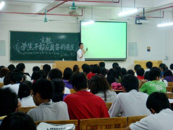 在历时一小时零10分的过程中,首先黄书记向干部们指出了3个普遍存在的问题:①对学生干部的认识不到位;②对学生干部素质或能力不到位;③学生干部努力的程序与方向不到位。然后,黄书记给干部们解析学生干部的具体内涵。其次,黄书记向干部们讲述了高校学生干部应具备的五个素质: