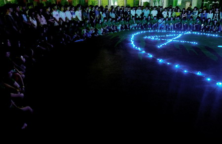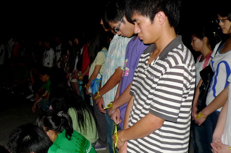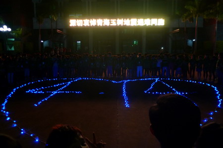 默哀仪式完毕后,很多同学还站在原地,默默地低着头,不肯离去,他们的思绪仿佛和他们的祝福一样,带到了灾区,给灾区人民带去力量;从旁路过的同学也默默地站在心型灯光周围默哀,送上他们对灾区同胞的深深祝福!灾难无情,人间有爱。管理学子用自己的方式向上天祈祷玉树同胞们走出困境,重建家园。