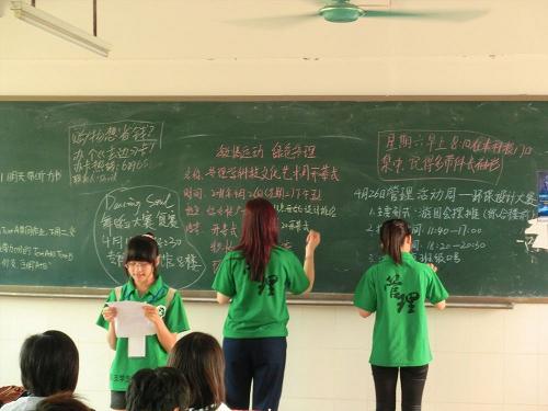在这激情似火的4月,我们即将迎来以“自觉环保,健康你我”为主题的管理学部活动周。为了让每位同学都能了解活动的整个流程,都能积极踊跃参加,也为了让每个班级都能更好的发挥班级智慧,展现班级活力,4月15号晚上7:00学生会的实践部,文娱部,体育部,纪检部和秘书部的干事进行了班级宣传。