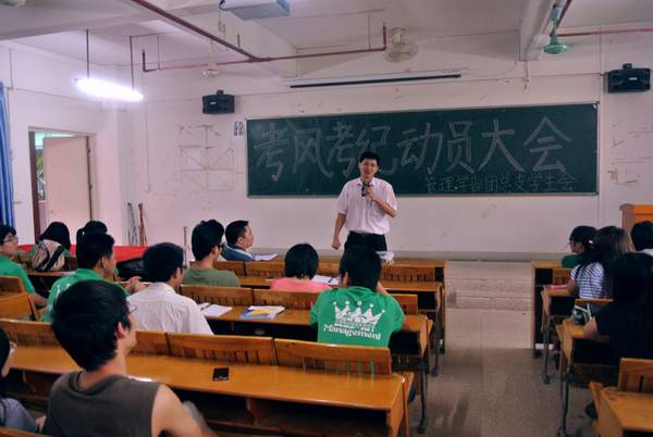 为进一步加强考风考纪建设,构建诚信校园和保证期末考试的顺利进行。2012年6月6日我学部在第五教学楼202教室召开了考风考纪动员大会。参与本次大会的有管理学部党支部书记李玉林,辅导员姚轲邺老师,辅导员胡德森老师,辅导员李作芳老师,辅导员徐香华老师,辅导员助理麦忠源师兄,各班班长、团支书、学习委员和纪检委员以及管理学部团总支学生会干部。