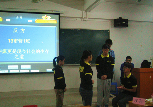 2013年管理学部班际辩论赛正火热进行中,12月4号晚上,在5号楼202由正方13工商3班与反方13市营1班进行半决赛对决。本场比赛邀请了管理学部辩论队副队长贺彬、传艺学部辩论队队长黄容清、经济学部辩论队队长房鸿昭作为评委,为选手进行评分指导。
