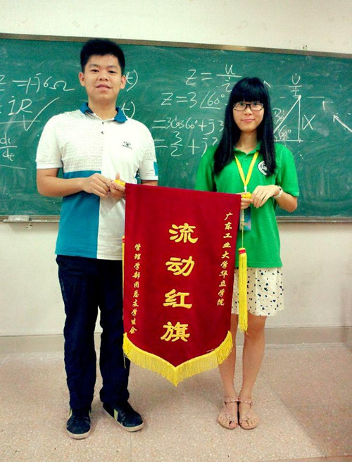 2014年5月12日早修,管理学部进行了本学期第五次流动红旗颁奖仪式。13工商管理(2)班、13市场营销管理(2)班分别获得本次第一名和第二名。管理学部团总支学生会纪检部部长周智宇和生活部部长马燕妮为获奖的班级颁奖,并表示祝贺。