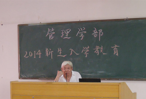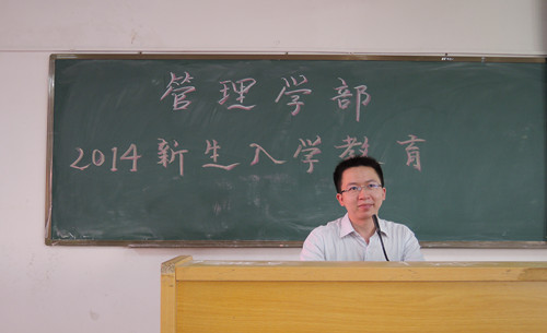 2014年8月25日10时30分,管理学部2014级新生第一堂大学课的帷幕在3号楼407隆重拉开,到场的领导和老师有:部长李季霞,党总支书记李炽平,团总支书记、14级辅导员胡德森,物流管理教研室门玉枢教授,市场营销教研室主任白胜陶,工商管理教研室主任梁景湖,人力资源管理教研室主任肖璐,以及学部党建、团学和AM艺术团的主要负责人。