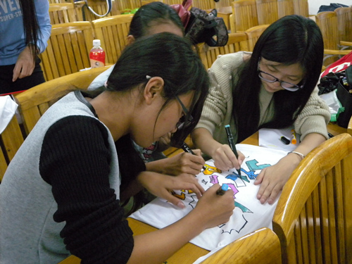 下午17点30分,涂鸦大赛开始。参赛选手是来自六个班级派出的十二支队伍,同学们纷纷挥起手中的画笔,马不停蹄地大胆创作,力争在有限的一个小时内完成涂鸦作品。这次涂鸦大赛邀请的评委是管理学部团总支学生会主席团,从主题创意、色彩搭配、解说以及时间控制四个方面对作品进行评分。作品将于12日在五号楼门前展出。