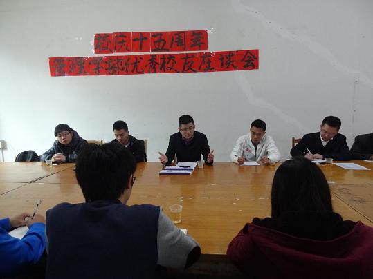 在校庆十五周年即将到来之际,管理学部于2014年12月25日14:00在五号楼111会议室举行了管理学部优秀校友座谈会,学院校外教学管理处处长李斌、管理学部党总支书记李炽平、市场营销教研室主任白胜陶、管理学部校外教学与就业副主任刘伟等领导和老师以及部分学生代表参加座谈会。2009届市场营销管理专业余少伟、2013届工商管理专业曹宇定等两位优秀校友代表应邀参加本次座谈会。座谈会由刘伟老师主持。
