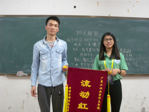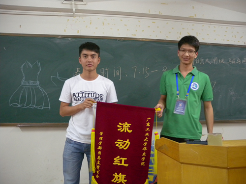 2015年4月7日晚修,管理学部团总支学生会生活部上班进行了“流动红旗”的颁奖。此次评比中获得第一名是14市营1班,第二名的是14物流1班,由管理学部团总支学生会生活部副部长董文敏和纪检部副部长冼静茹为获奖班级颁奖。天道酬勤,付出辛勤的汗水总会有所收获,相信大家会继续加油,让自己的课室变得更干净漂亮。