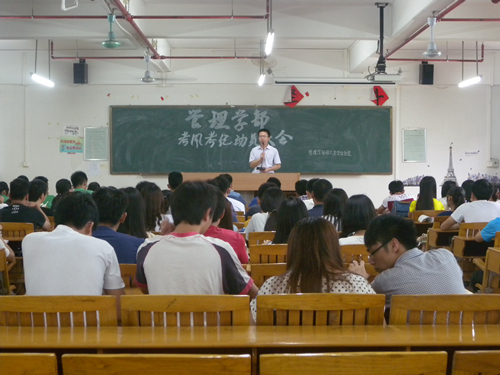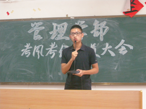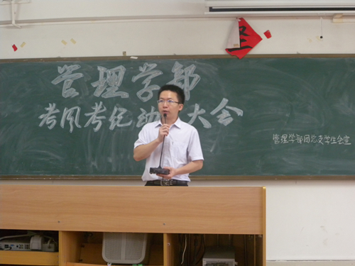 2015年6月11日下午五时十五分,由管理学部团总支学生会纪检部主办的考风考纪动员大会在5号楼502举行。本次大会主要针对即将到来的英语四六级考试以及期末考试,强调考风考纪的重要性。