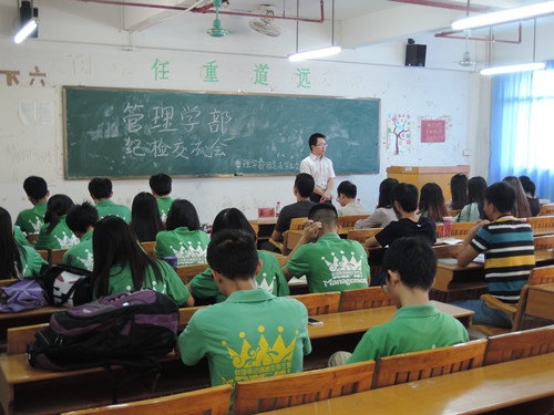 本次交流会在管理学部团总支学生会纪检部预备部长黄靖钊的主持下,意在增强各班纪检之间的沟通与联系,共同为管理学部考勤工作奉献应有的力量。李书记在讲话中强调各班纪检要清楚各自工作中的难点和要点,保持工作的灵活性;要提醒和督促班上的同学做好考勤,同时做到以身作则。李炽平书记还寄望在未来的一学期里,大家相互监督合作,共同营造管理学部良好的学风。