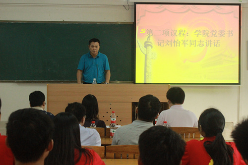 会议伊始,学院党委书记刘怡军同志发表了讲话。首先,他对此次党员大会的顺利召开表示了热烈祝贺。其次,他对总支委员由以教工为主的精英骨干组成表示了支持,并要求总支委员发挥把关与指导的作用,提高支部战斗力。最后,他提出了几点希望:第一,希望新一届的党组织进一步加强党的建设,发挥支部带头作用;第二,希望党员同志探索党支部工作责任制与学生党员综合评价机制,发挥党员先锋模范的作用;第三,希望加大党员干部培训教育的力度,提高党员干部的理论知识水平和能力水平,并创新党建活动,打造良好学风建设,建设服务型党支部。
