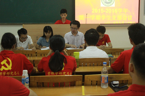 2015年9月24日17时,管理学部党总支学生党支部在5号楼409教室召开支部大会。出席此次会议的有管理学部党总支书记李炽平同志、工商人力支部书记张雪玉同志、市营物流支部书记李文勇同志及全体在校学生党员。