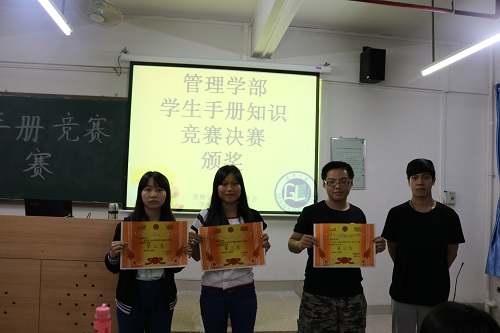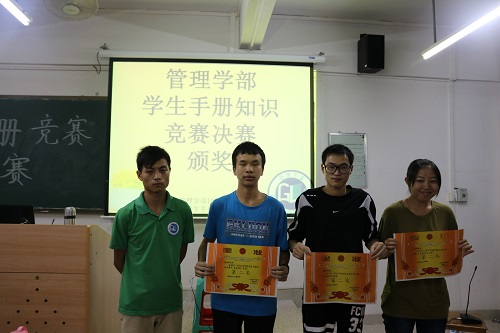经过激烈角逐,来自第6组的陈小并、袁丽洁和陈美琪3名同学荣获冠军,第五及第四组分别获得亚季军。而获得冠亚军的两支队伍将代表管理学部参加院级学生手册知识竞赛。