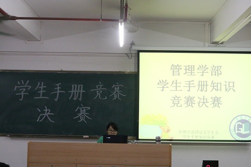 2015年11月12日晚7点,管理学部2015届学生手册知识竞赛决赛在5号教学楼409教室隆重举行。本次活动旨在营造良好的校风学风,倡导大一新生遵守学院规章制度,努力提高个人综合素质,展现当代大学生的精神风貌。本次活动还邀请到管理学部团总支学生会主席汤海辉作为出席嘉宾。