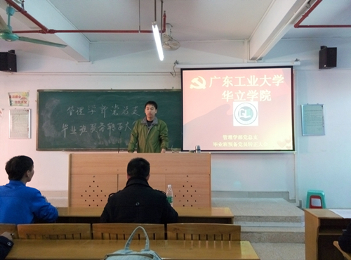 接着,由管理学部党总支毕业班党支部书记刘伟同志发表讲话。他对党员同志提了几点希望:第一:希望在座的党员能不断加强党的基本知识、基本理论的学习,用知识武装自己的头脑,不断提高和完善自己;第二,他希望在座的每位党员同志能理论联系实际,把学习到的党的理论知识落实到行动上,在思想、学习、工作以及生活中保持党员的先进性,发挥党员的先锋模范作用。