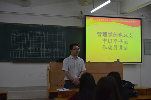 2016年4月11日19点30分,管理学部党总支在5号楼409课室召开了第41期党校动员大会,参加此次会议的有管理学部党总支书记李炽平同志、党务秘书以及参加第41期党校培训班的19名入党积极分子。