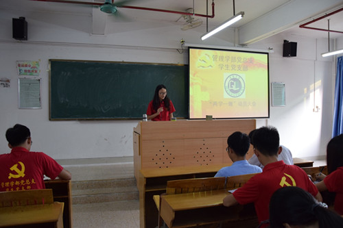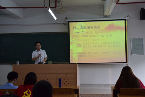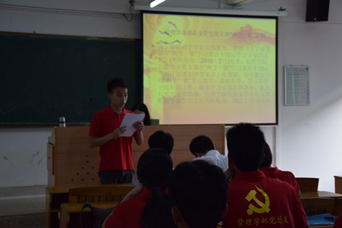 会议的第一项议程,由市营物流党支部副书记庞尧志同志宣读管理学部党总支学生党支部“两学一做”学习计划,从中我们知道了此次学习分为四部分:一、党员个人自觉学习党章党规内容并分享自学成果;二、党员集体学习《中国共产党普通高等学校基层组织工作条例》以及观看相关视频;三、党员集体在微信上转载、传播 “两学一做”知识及见解;四、党员集体开展打扫学生宿舍楼梯卫生的志愿服务活动。