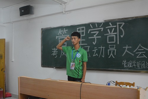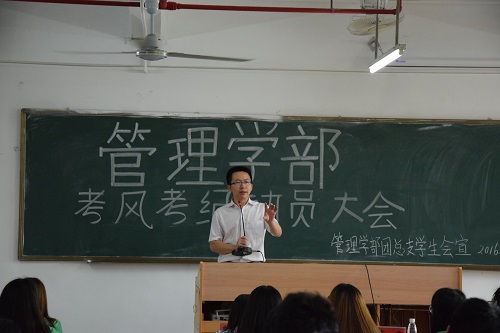 2016年6月22日下午,管理学部举行了本学期考风考纪动员大会,本次大会由团总支学生会纪检部主持,并邀请了管理学部党总支书记李炽平、团总支书记张雪玉、13级辅导员李文勇以及14级辅导员赖嘉琪和团总支学生会主席团成员出席。