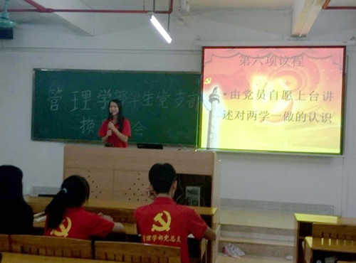然后,由新任支部书记张雪玉同志作出讲话,她提出接下来的一年是一个充满挑战的新阶段,希望大家一起努力把学生党支部越办越好。接着,党务秘书梁梓欣同志宣读了学部学生党员“两学一做”的考试成绩,鼓励党员能够再接再厉,不断学习党的理论知识。会议的最后,由学生党员自愿上讲台讲述对“两学一做”的认识,从中我们知道,作为一名大学生党员,应该要了解国内外的政治,用知识武装自己,使自己变得更加优秀。