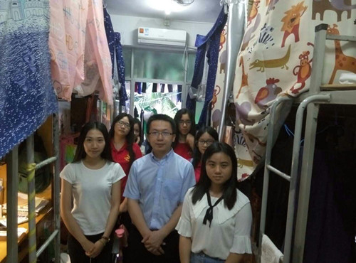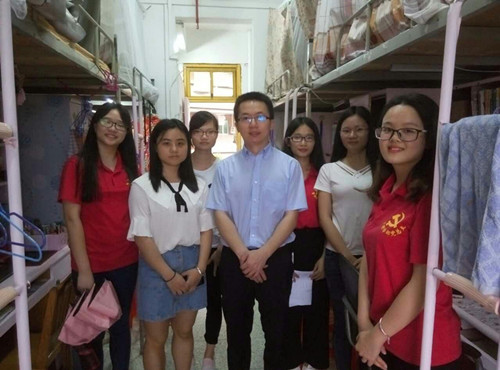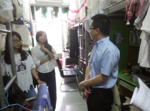 2017年5月8日17时,为了更好地了解党员的日常生活状况,以及对大一新生进行近距离的慰问与关心,管理学部党总支书记李炽平同志携同学生党支部书记张雪玉同志带领学部党务秘书和党务干事走访了党员“示范岗”宿舍。