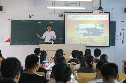 党总支书记胡德森讲授的主题为“坚定跟党走,共圆中国梦”。他讲述了从中国共产党成立到新中国成立的苦难而辉煌的历程,通过那段红色的峥嵘岁月,在场的师生感受到了中国共产党人大无畏的革命英雄气概;他还从新中国成立、改革开放、全面建设小康社会等几个阶段,详细分析了中国的政治生态与外国的政治生态相比之优越性,通过大国崛起的客观规律,旁征博引地阐述了中华民族伟大复兴的中国梦的美好未来。