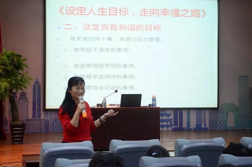 丁元教授结合自己的经历,运用心理学知识向同学们讲述如何通过设定人生目标,帮助同学们寻找幸福生活的方法。在讲座中,丁教授着重从以下几方面进行讲述:第一、幸福是一种能力;第二、设定自我和谐的目标;第三、培养钝感力。在讲座的最后,丁教授还讲了设定不同阶段目标一些方法和培养钝感力的一些技巧。在讲座过程中,丁元教授通过提问与在场同学们进行互动,同学们积极回应,踊跃参与。