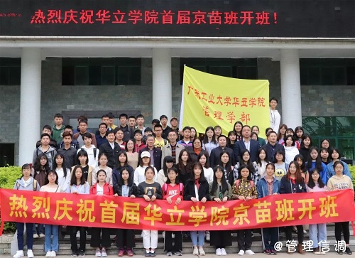 2019年3月1日上午,广东工业大学华立学院与京东合办的首届“京苗班”开班仪式在综合楼广场隆重举行,出席活动的领导嘉宾有:副院长郭颂平、副院长王学军、院长助理李玉林,教务处处长曾超益、校外教学管理处处长习宗德,管理学部部长李季霞、党总支书记胡德森、相关教师代表以及本届“京苗班”相关专业的学生。大会由管理学部部长李季霞主持。