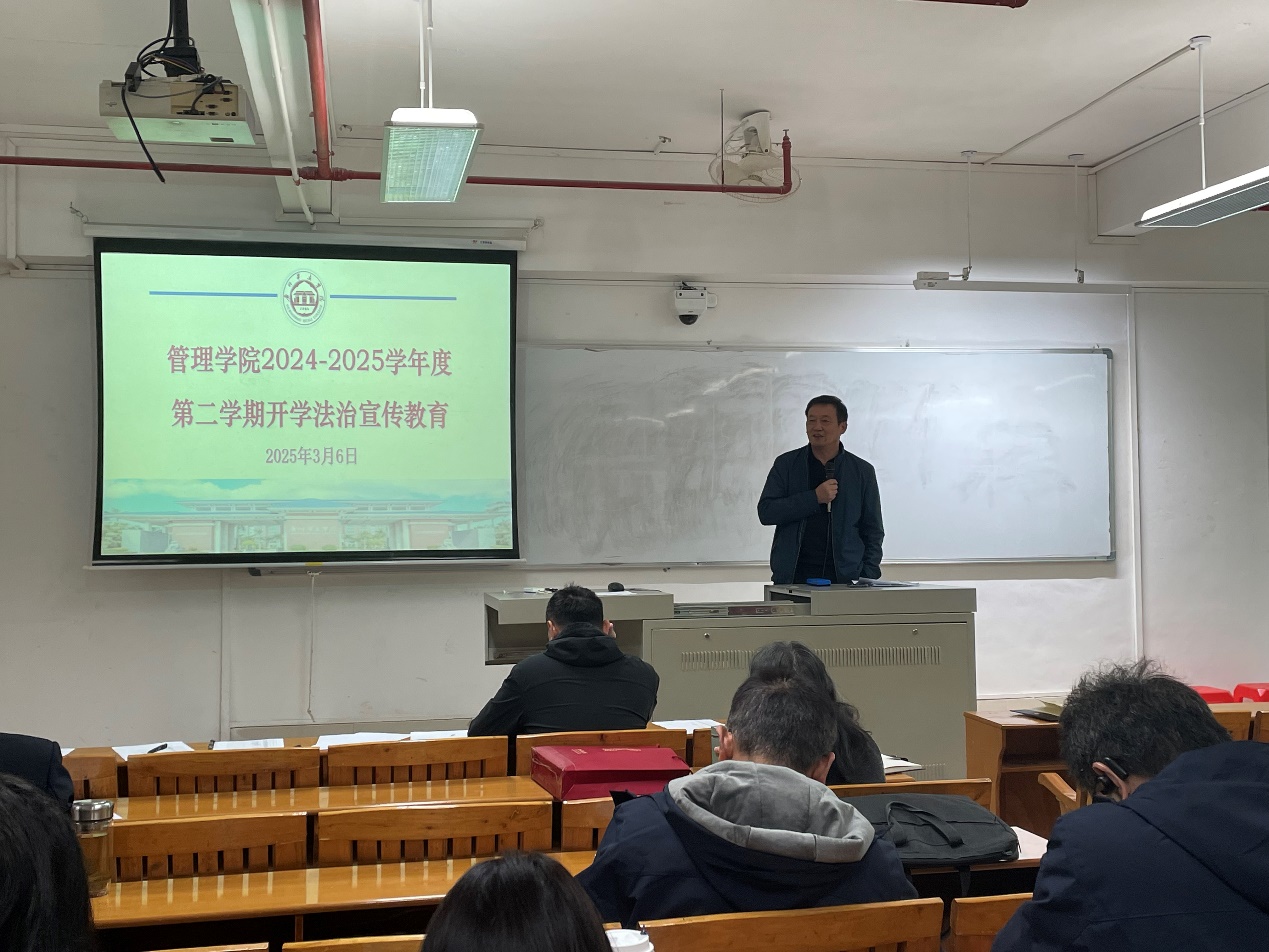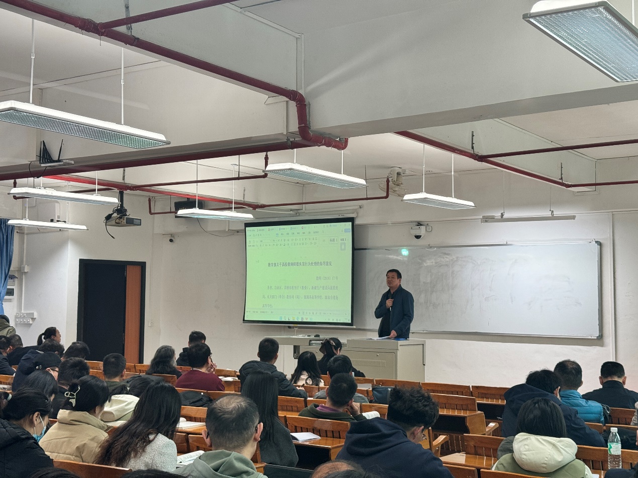 为进一步加强师德师风建设,提升全体教职工的法治意识,营造良好的教育教学环境,管理学院于2025年3月6日下午在5教706室组织开展了法治宣传教育活动,张能福院长和于江书记分别就师德师风建设、有关法律法规核心要义等内容进行了深入讲解,全体教职工积极参与,认真学习。