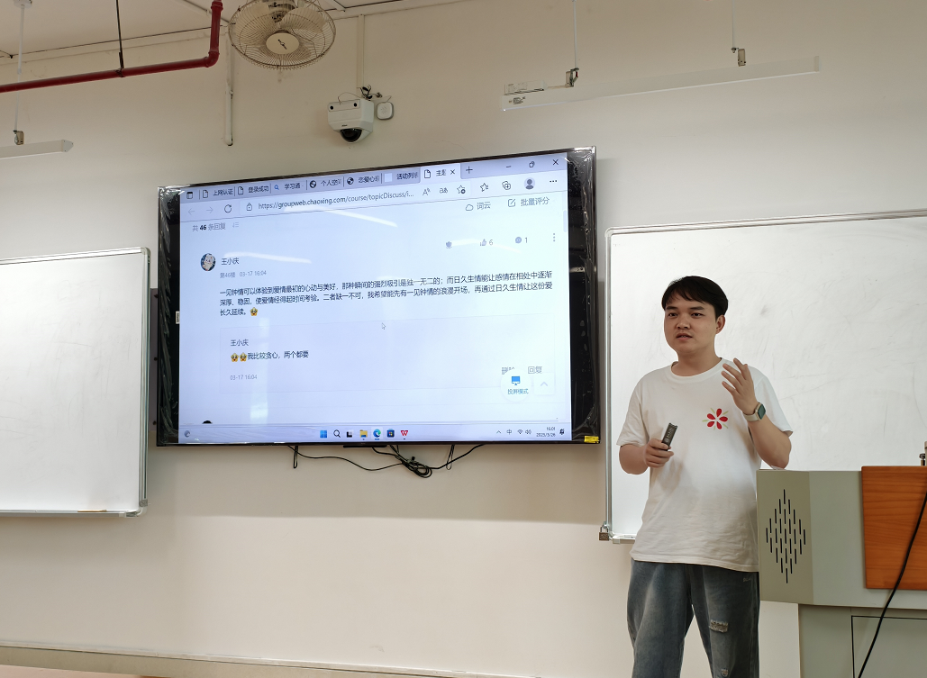首先登场的梁建华老师,带来别出心裁的《恋爱心理学》说课。课程伊始,梁老师从选修须知切入,点明《恋爱心理学》作为高校热门选修课的独特价值,帮助学生认识到这门课程是关乎人生的 “必修课”。梁老师创新性地运用超星学习通平台的讨论组功能,引导学生围绕 “结婚应选择爱你的人还是你爱的人” 等热门话题展开互动。在讨论过程中,梁老师结合斯滕伯格爱情三元理论,即亲密、激情、承诺,并融入丰富的现实案例,让学生在案例分析与观点碰撞中,深刻反思恋爱中的理性选择与自我成长,不仅彰显了情感教育对学生心理健康的重要意义,也为数字化互动教学在课程设计中的应用提供了范例。