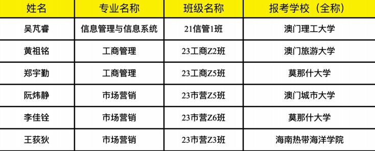 考研结果近⽇公布, 我院学⼦成功上岸, 等 6 名同学凭借扎实的专业基础与不懈努⼒, 成功考取澳⻔理⼯ ⼤学等国内知名⾼校硕⼠研究⽣ (详⻅名单), 升学质量与数量实现双突破!