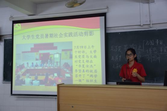 机电学部党务管理办公室主任魏海媚上台为新生解说党员暑期实践活动内容,并鼓励新生积极向党组织靠拢,好好学习,为学部学院作贡献,为国家的富强尽一份力。
