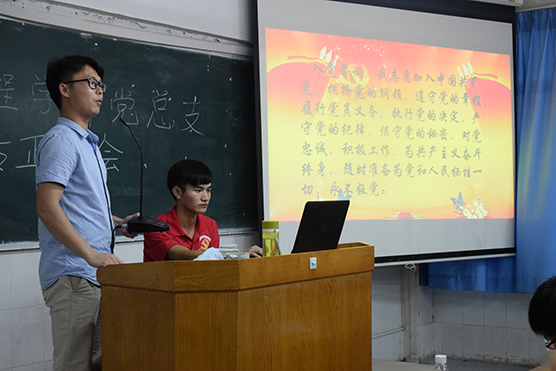 最后,重温入党誓词。由陈智鹏老师领誓,全体起立,用慷慨激昂的入党誓词表现对党的热爱表明积极入党的决心。