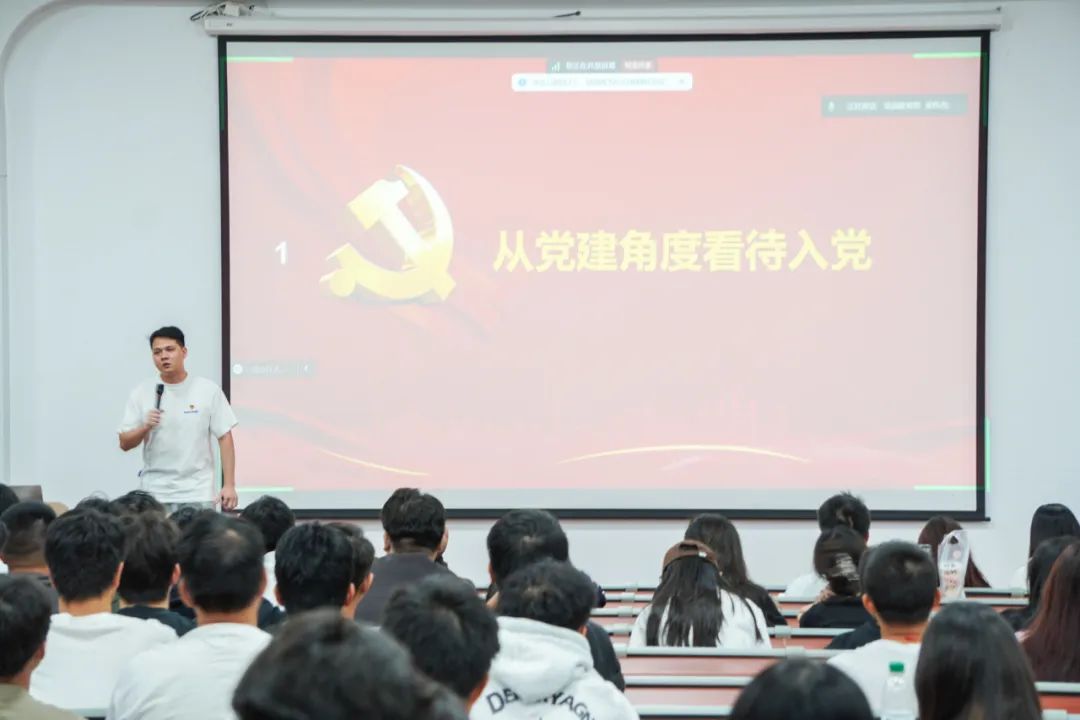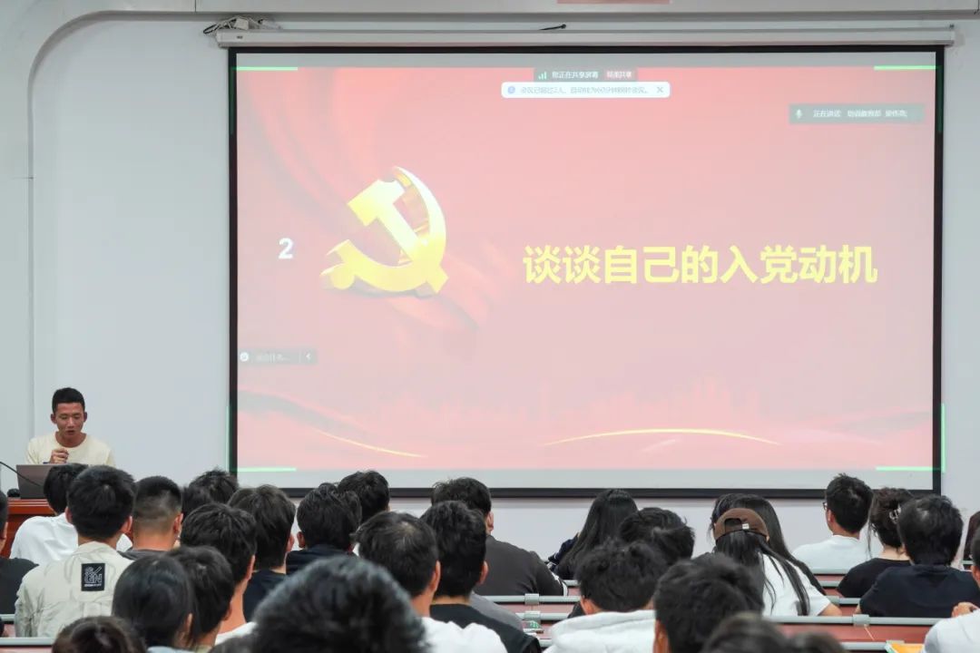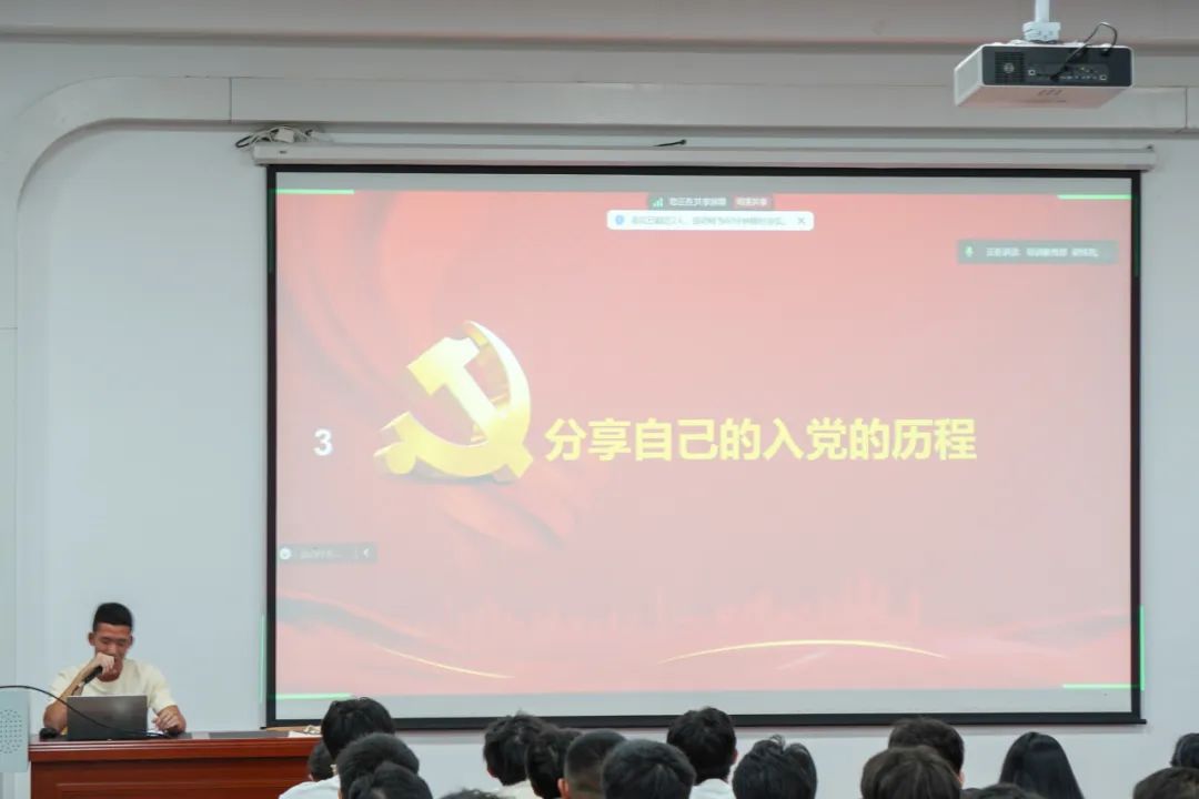 最后,学生党员林文超为我们分享了自己的入党历程:一是眼见,这是需要有用心去观察、去领悟、去洞察的能力,它能让我们及时发现问题,把握机遇;二是实干,这意味着不务空名,不图虚名,“纸上得来终觉浅,绝知此事要躬行。”