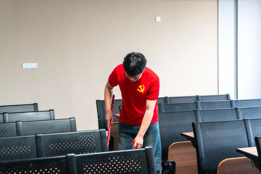 在教室中,党员同志及党务干部默契配合,分工合作,明确各自打扫范围,细心清扫,以行动诠释责任,让教室焕发出整洁新貌。