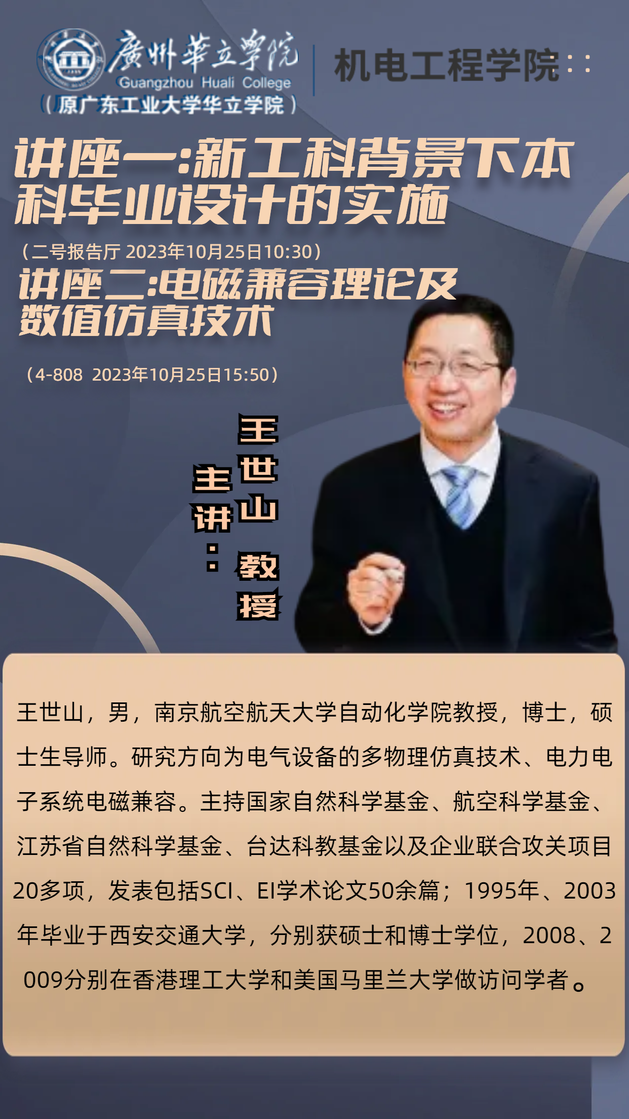 为了提高科研工作宣传力度,增强科学研究意识,推动我校高质量发展,由广州华立学院科研处主办,机电工程学院承办“科研工作大会系列讲座”,本期特邀请南京航空航天大学自动化学院王世山教授做主题讲座,活动安排如下: