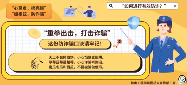 我院组织学生会制作反诈宣传海报,充分利用学院宣传栏张贴反诈宣传标语,在学院营造浓厚的防范诈骗氛围,进一步提高了学生们识骗防骗的意识和能力,有效地防止了电信诈骗案件的发生。