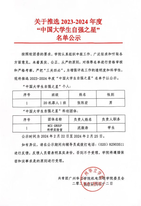 机电工程学院2023-2024年度“中国大学生自强之星”推选名单公示