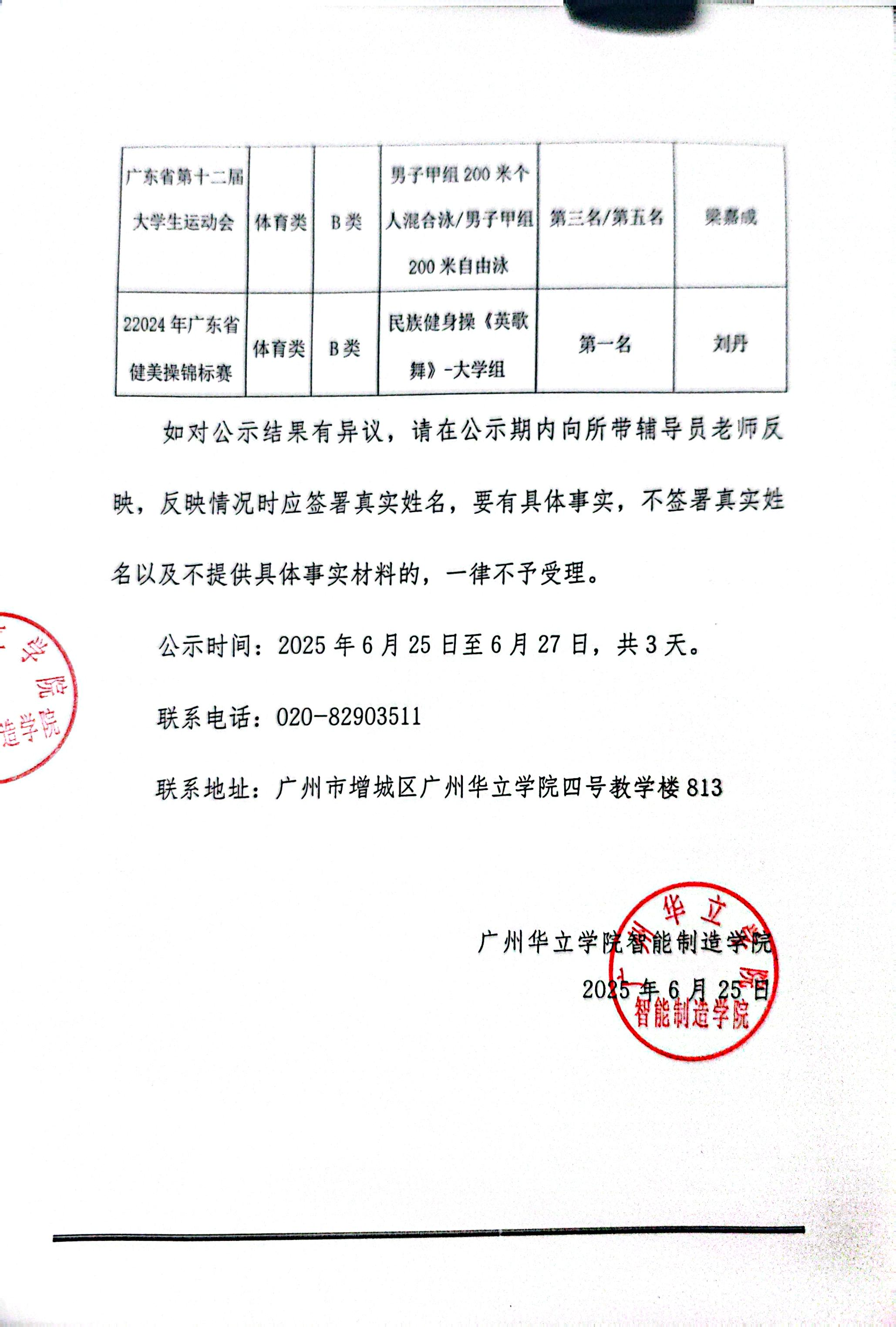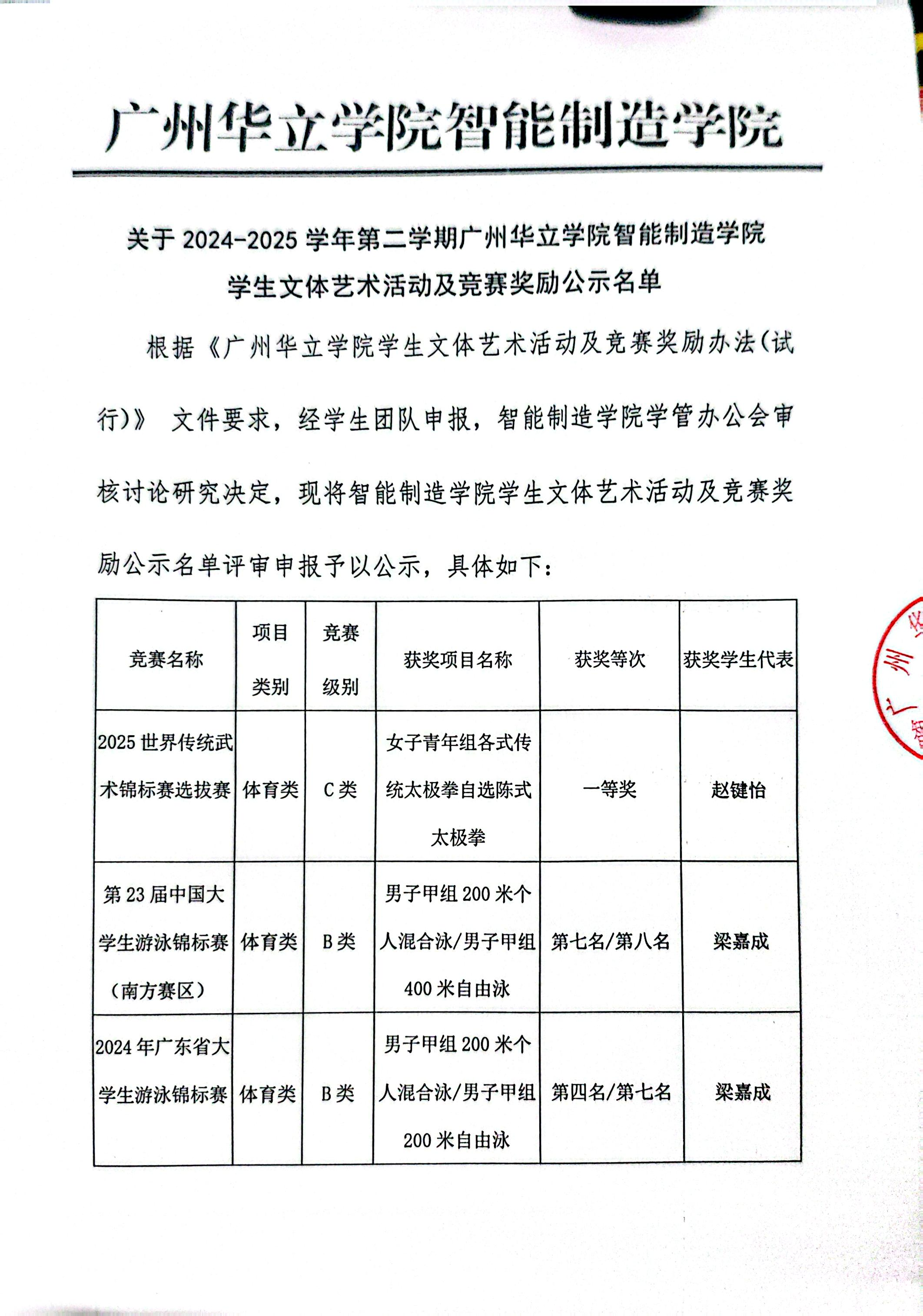 智能制造学院学生文体艺术活动及竞赛奖励公示名单