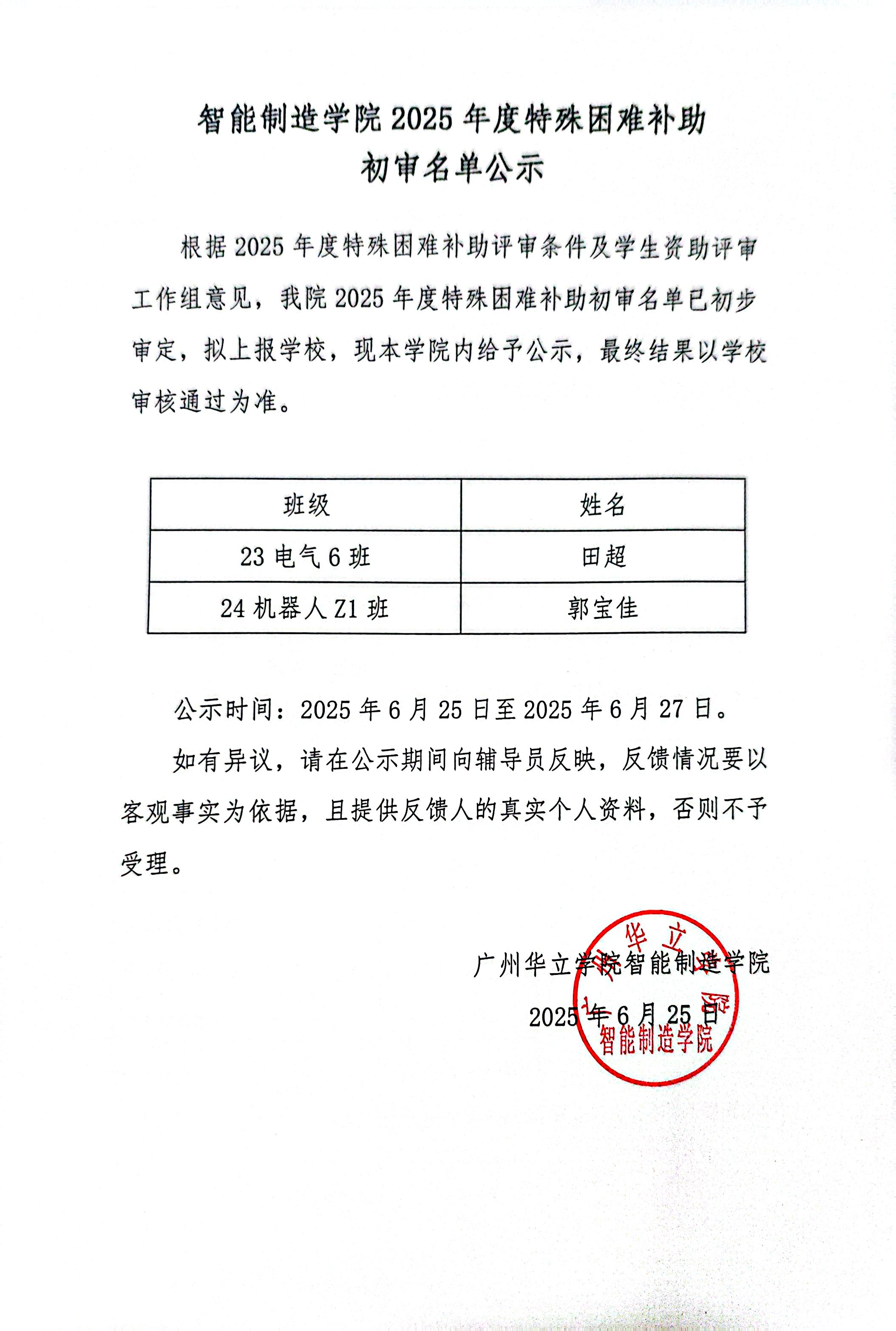 智能制造学院2020年特殊困难补助初审名单公示
