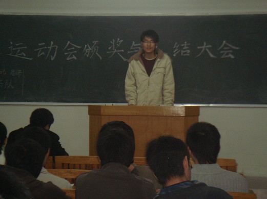 2008年12月16日下午6:00,电气工程系运动会总结及表彰大会在1号楼608隆重召开,这次会议充分表现出了我系对这次校运会重视和下一届运动会会有更多人积极参加打下了基础!参加本次会议的嘉宾有电气工程系李玉林书记、电气工程系陈蕤老师 、优秀运动员代表以及电气工程系方队代表,本次会议由黄欣欣同学主持。